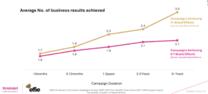The research confirms the power of “brand-led growth”, as opposed to driving growth with tactical marketing. Campaigns that achieved 4+ “Brand Effects” (e.g. Awareness, Image, Distinctiveness) achieved more “business results” (e.g. Revenue, Profit, Market Share) than those with less Brand Effects.