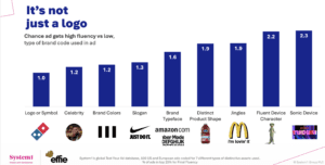 We’ve posted many times on the important role played by “distinctive brand assets” (DBAs), such as logos, slogans and colours. The study confirms how DBAs boost the brand fluency that, as we saw earlier, drives not only distinctiveness but also profit. See how sonic devices (below, far right column) are the most effective form of DBA, as we posted on here. And how characters, that we also posted on here, are almost twice as effective as celebrities.